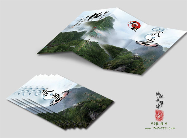在日常宣傳推廣中,很多企業都會選用折頁的方式作為宣傳單進行派發,而三折頁的折疊方法是廣泛的折頁折法之一,一般來說,三折頁會采用16開的大度尺寸285mm*210mm(291mm*216mm 含3mm出血),我們打開三折頁不難發現總共有三頁六個版面,有興趣的朋友不妨自己弄一張紙來折疊一下看看實際效果。下面我們已“武當山”的宣傳三折頁的其中三個頁面的設計效果圖